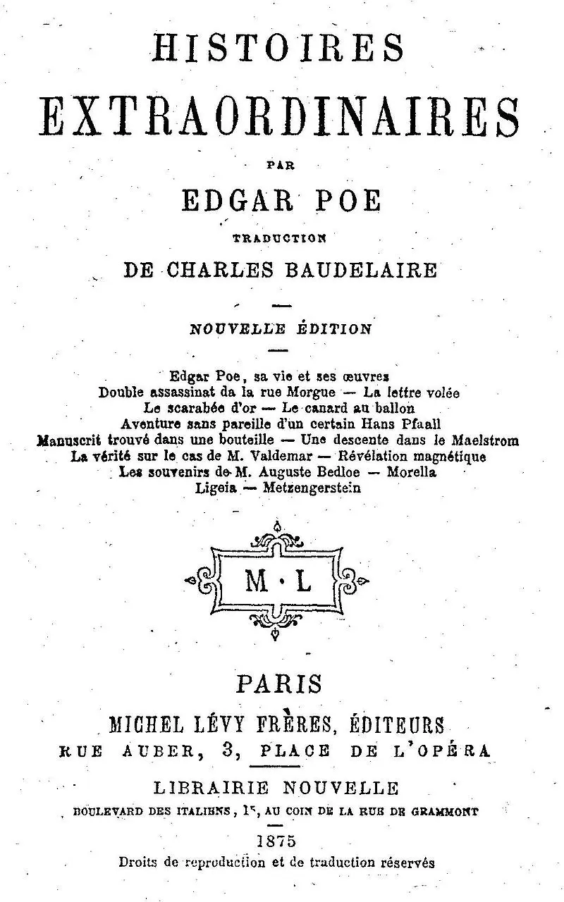 Roman: Histoires Extraordinaires. Edgar Allan Poe (1856). Traduction française par Charles Beaudelaire.