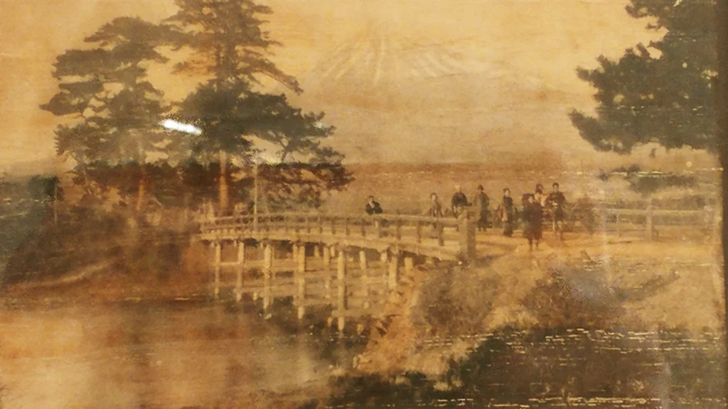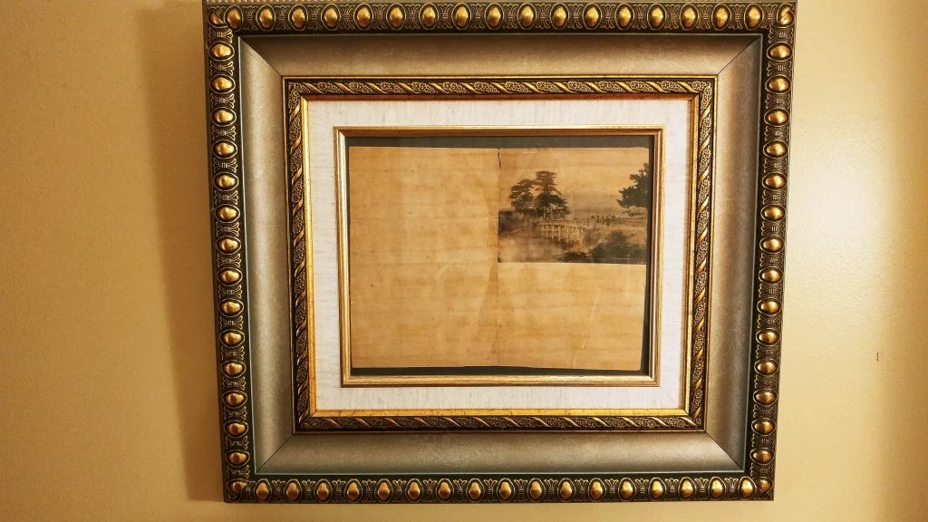 Piece of Japanese papyrus very finely drawn in part, from late 18th century Japan and finely framed with glass to protect its unique character. Work of great rarity. The pattern represents a view of Mount Fudji with a river and a nice bridge, all in a natural greenery setting. The finely crafted golden frame was chosen to further enhance this piece of history. It measures 46cm wide and 41cm high. I’m asking $ 125 for a quick sale. I can go to the Greater Montreal area for an additional $ 15.