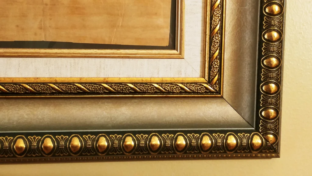 Morceau de papyrus japonais très finement dessiné en partie, venant du Japon de la fin du 18ème siècle et finement encadré avec vitre pour en protéger le caractère unique. Oeuvre d’une grande rareté. Le motif représente une vue du Mont Fudji avec une rivière et un joli pont, le tout dans un cadre naturel de verdure. Le cadre doré finement travaillé a été choisi pour mettre encore plus en valeur ce morceau d’histoire. Elle a été achetée dans les années 50 par l’écrivaine marseillaise Caroline Gréco, de son vrai nom Pia Schaufelberger et offerte à Roger-Luc Chayer, journaliste et musicien canado-français en 1998. Elle mesure 46cm large X 41cm haut. J’en demande 125$ pour vente rapide. Je peux aller livrer dans la grande région de Montréal pour un supplément de 15$.