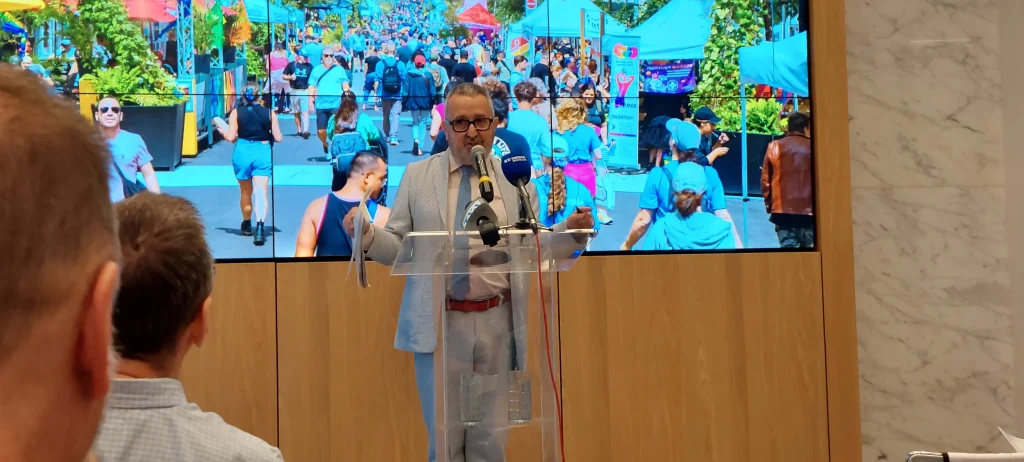 Le porte-parole de la conférence de presse, Monsieur Benoît Eclache, a livré un excellent discours sur le sérieux et les intentions de l’association, qui en a profité pour exprimer de nombreux soucis à Robert Beaudry. Le public a aussi pu livrer ses opinions et questionner l’élu sur les nombreuses consultations qui ne mènent souvent, du moins jusqu’ici, à quelque solution concrète sur le terrain. On le sait tous, le Village gai de Montréal vit une crise sans précédent et le point de rupture a été atteint en 2023 avec la menace de nombreux commerçants de fermer leurs terrasses afin de protéger leurs clients des individus criminalisés, drogués ou itinérants, présents à des niveaux records dans le Village.